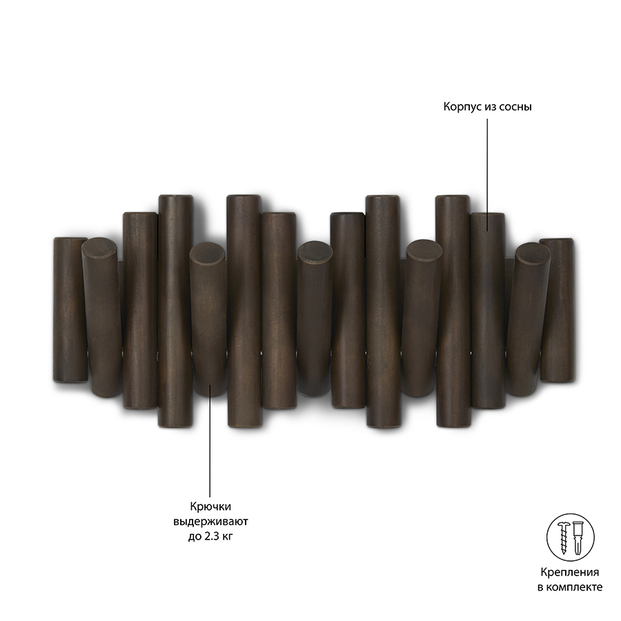 Вешалка состоит из сосновых колышков разных размеров. Аксессуар снабжен 5 складными крючками, которые способны выдерживать вес до 2,25 кг. Вешалка поставляется с набором крепежа.