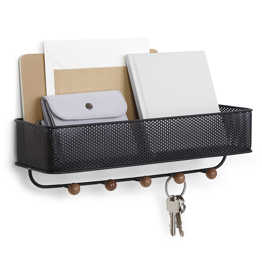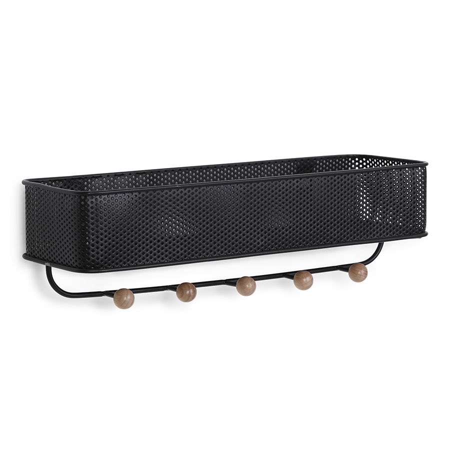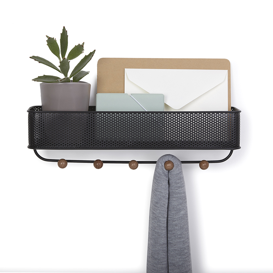 Настенный органайзер выполнен из перфорированного металла и натурального дерева. Каждый крючок выдерживает до 2,3 кг.