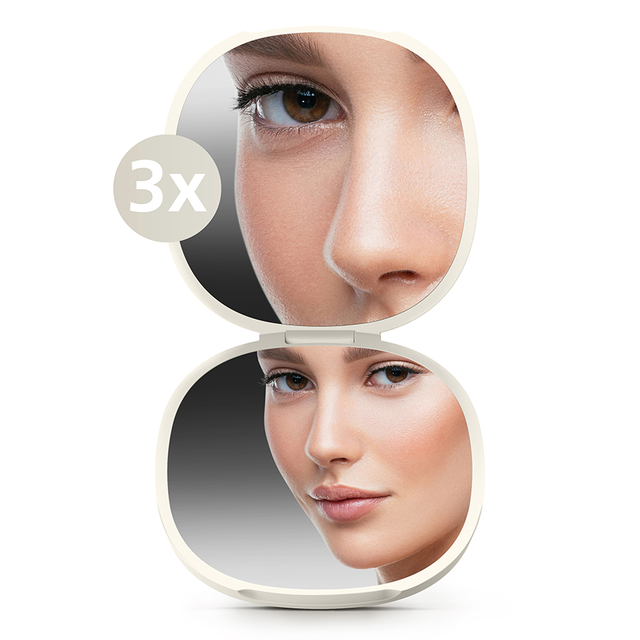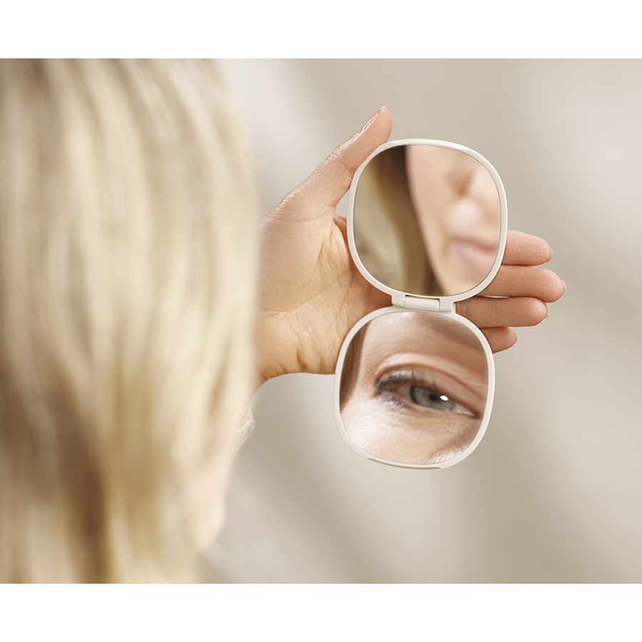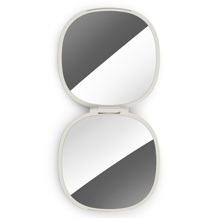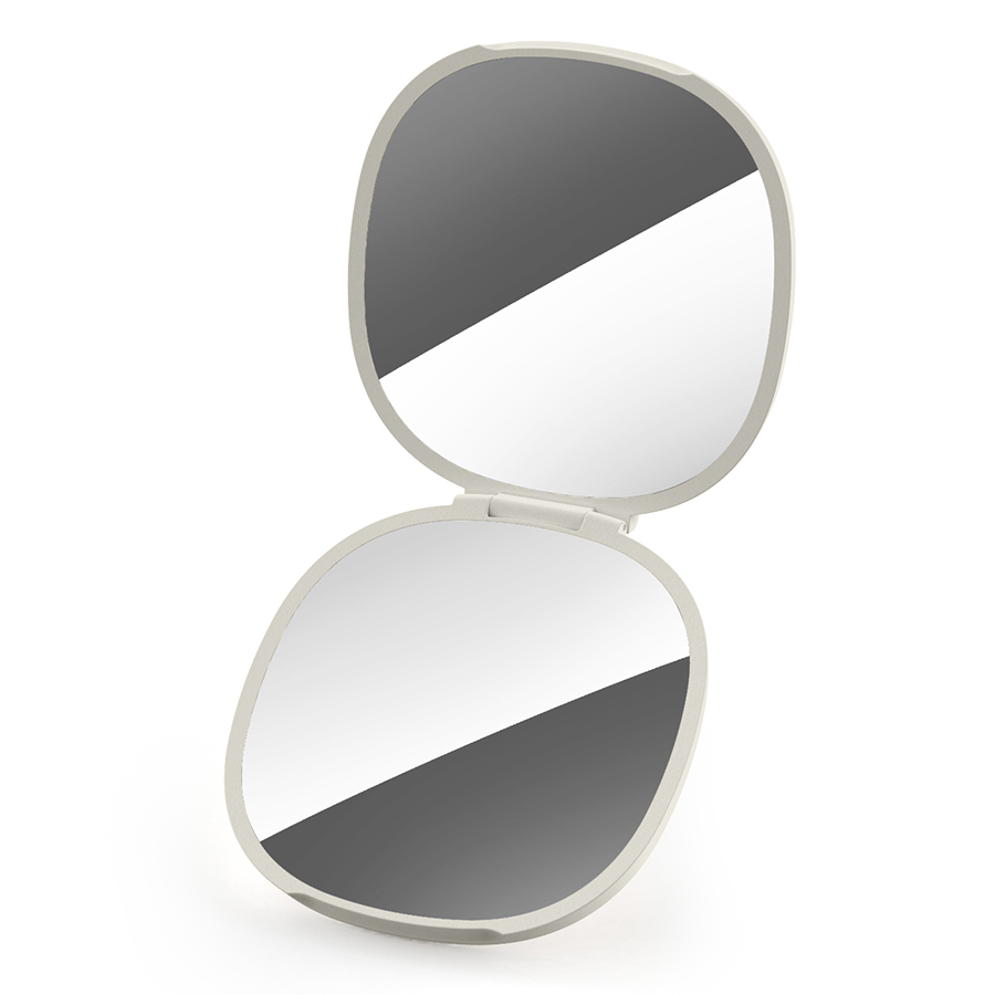 Одно зеркало дает отражение в натуральную величину, второе – обеспечивает троекратное увеличение, что удобно во время нанесения помады или туши. Аксессуар удобно держать в руке благодаря мягкому силиконовому ремешку, который также служит для хранения небольших предметов косметики, таких как карандаш для глаз или блеск для губ. Магнитный замок удерживает зеркало в закрытом состоянии.