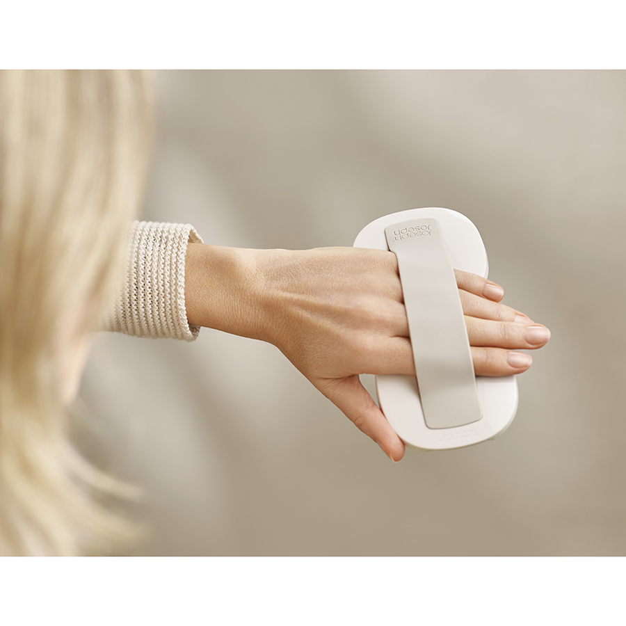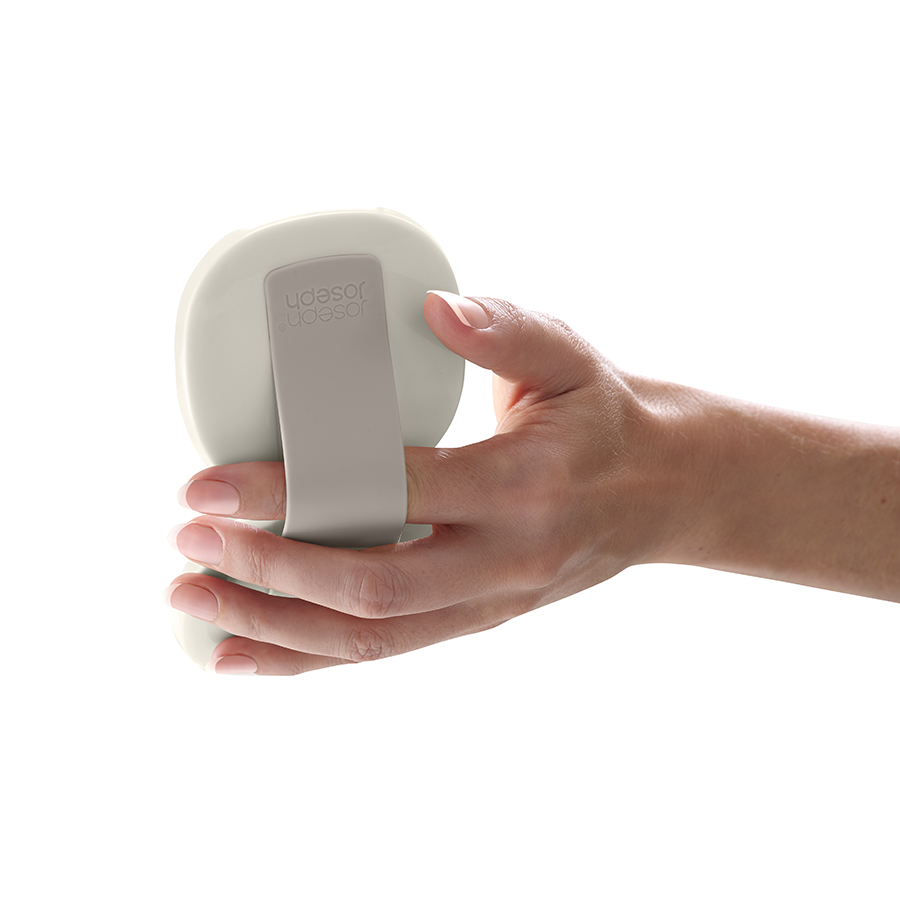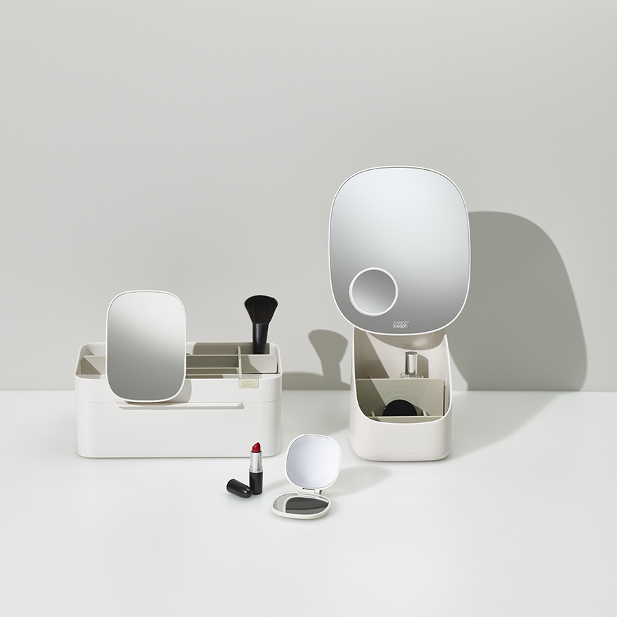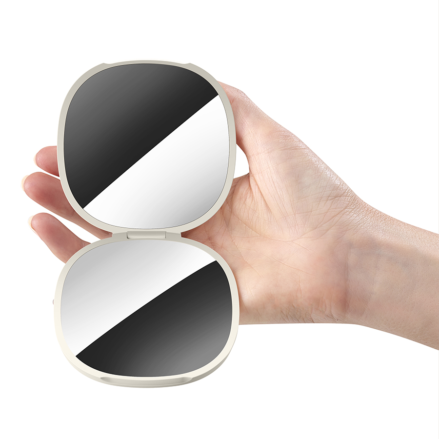 Одно зеркало дает отражение в натуральную величину, второе – обеспечивает троекратное увеличение, что удобно во время нанесения помады или туши. Аксессуар удобно держать в руке благодаря мягкому силиконовому ремешку, который также служит для хранения небольших предметов косметики, таких как карандаш для глаз или блеск для губ. Магнитный замок удерживает зеркало в закрытом состоянии.